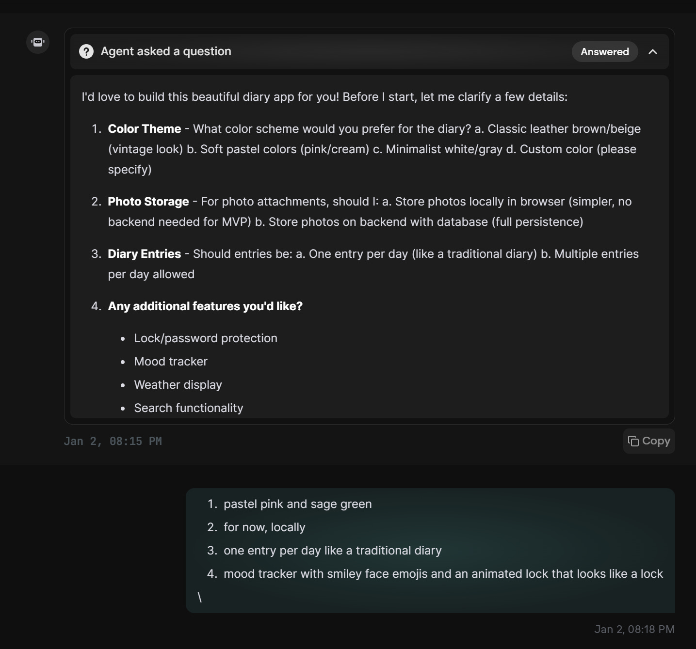 Then, AI implemented her feature request. But she wasn’t happy yet with that version. She wanted way more emojis and backgrounds! Here’s her next small incremental prompt: