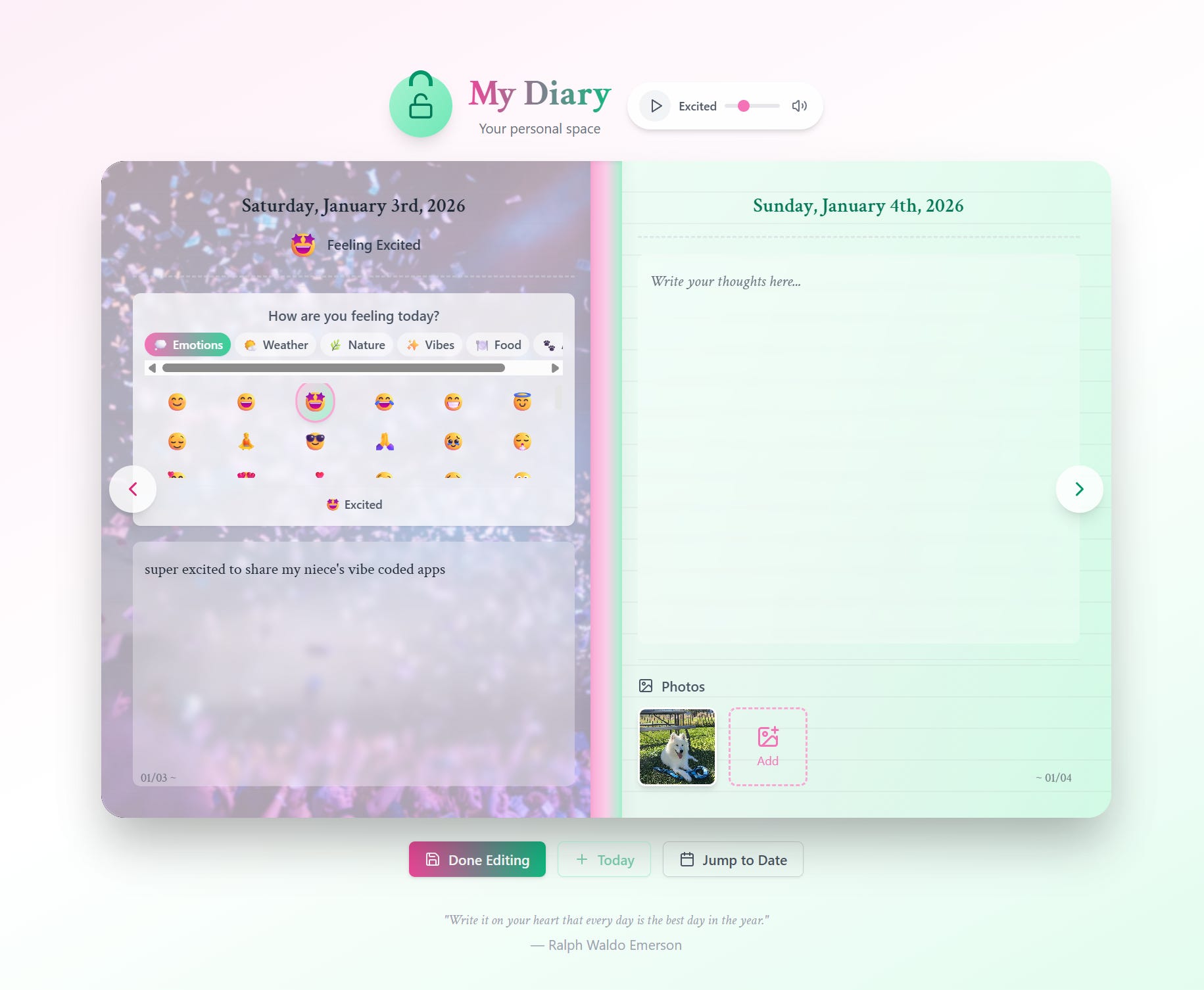 Build an online diary where on each page I write about my thoughts and can attach photos. It should look like a 2-page diary, with a flip animation to go the next page. And write the day on the top of each page.