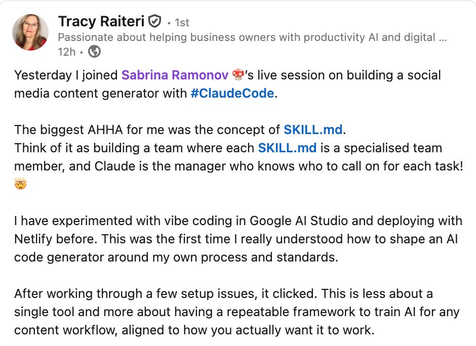 By the end, you’ll type 1 sentence and Claude will research your topic, draft a week of content, create visuals, show you the plan, wait for approval, and schedule everything to your socials.