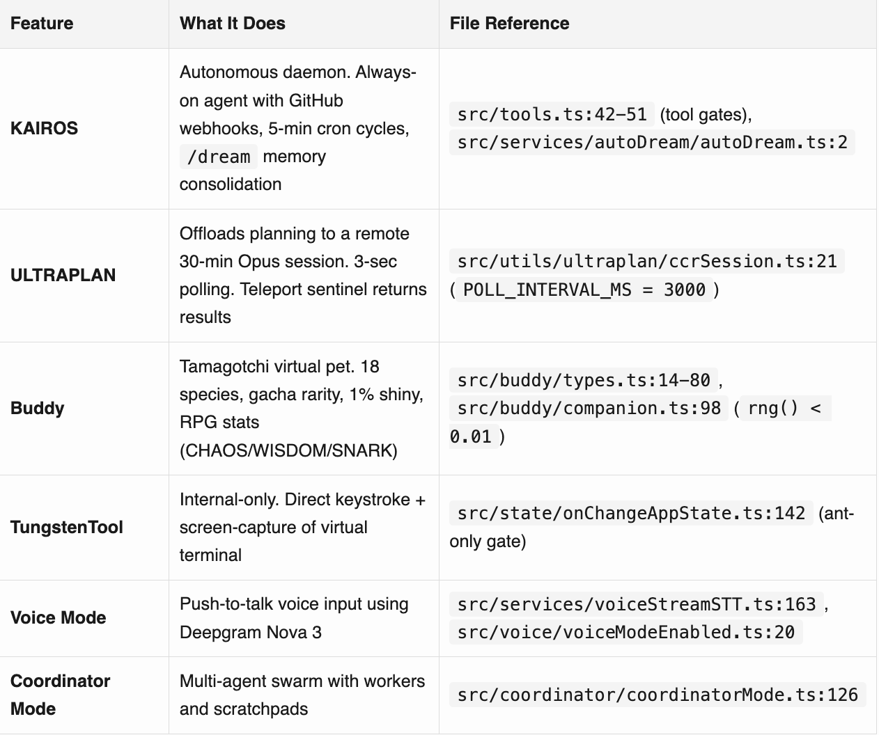 KAIROS is an autonomous daemon mode. Claude Code running unattended. GitHub webhooks. Scheduled tasks on 5-minute cron cycles. A /dream command for background memory consolidation. Exclusive tools not in the public build: SendUserFileTool, PushNotificationTool, SubscribePRTool.