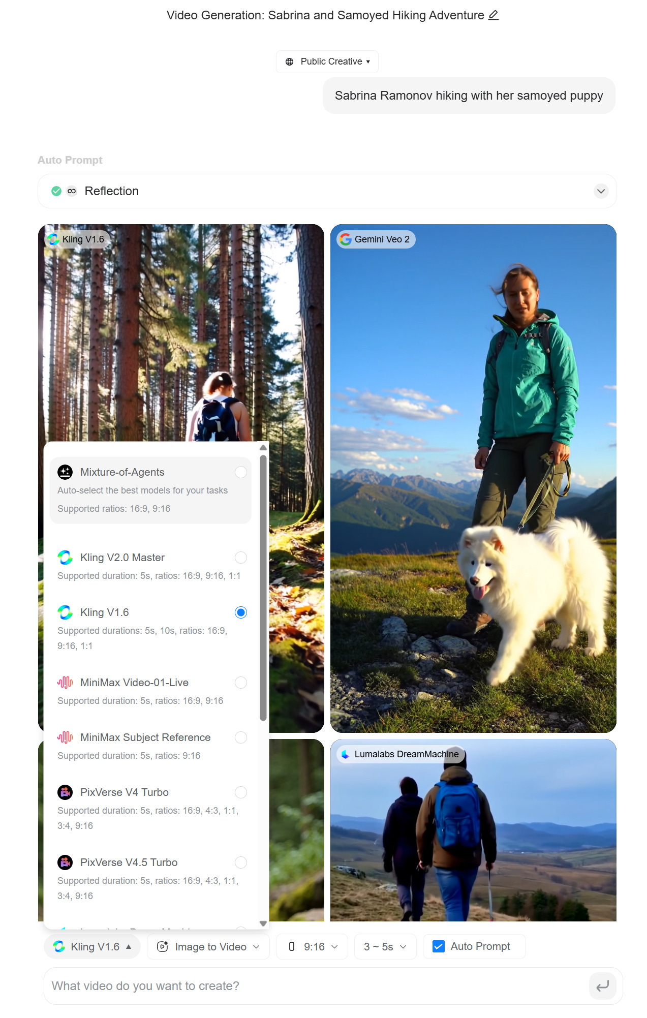 I gave Genspark a prompt “Sabrina hiking with samoyed puppy” and it generated AI videos using 4 different models.