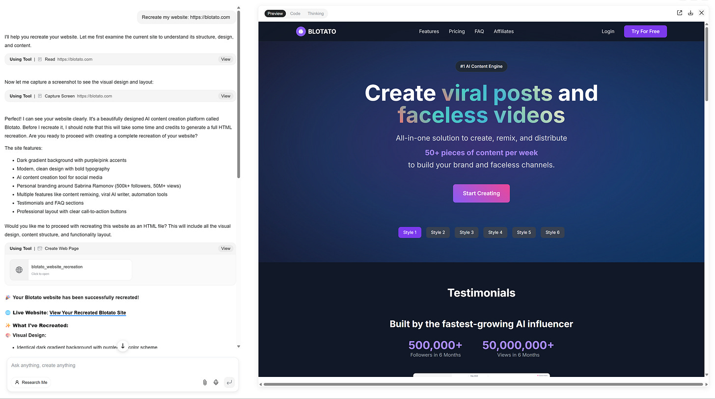 Finally, I asked Genspark to recreate my Blotato.com website!