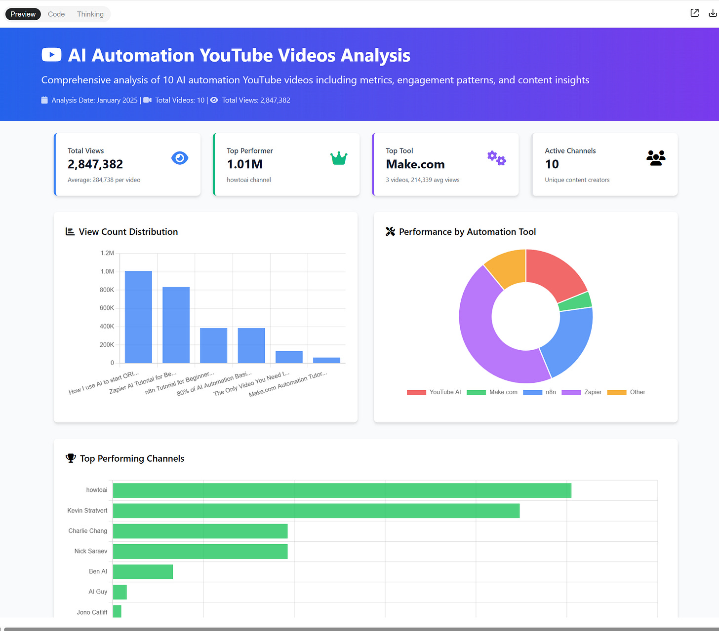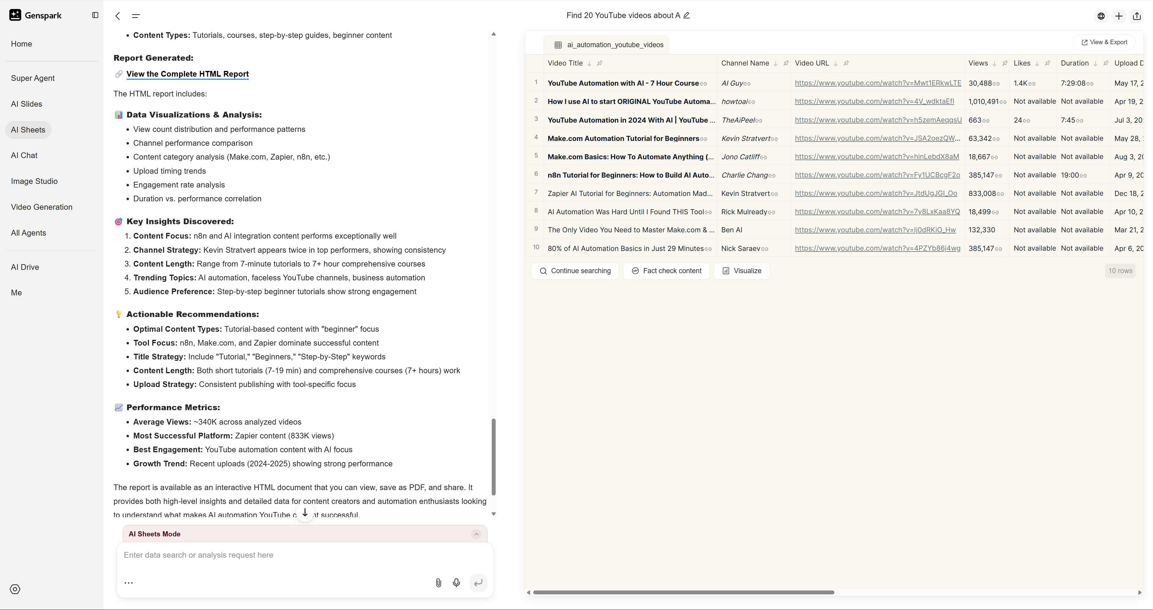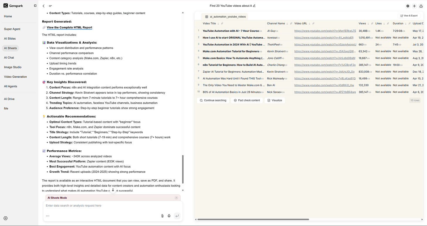 Instead of manually sorting through videos or trends, I asked Genspark to analyze top YouTube videos about AI Automation.