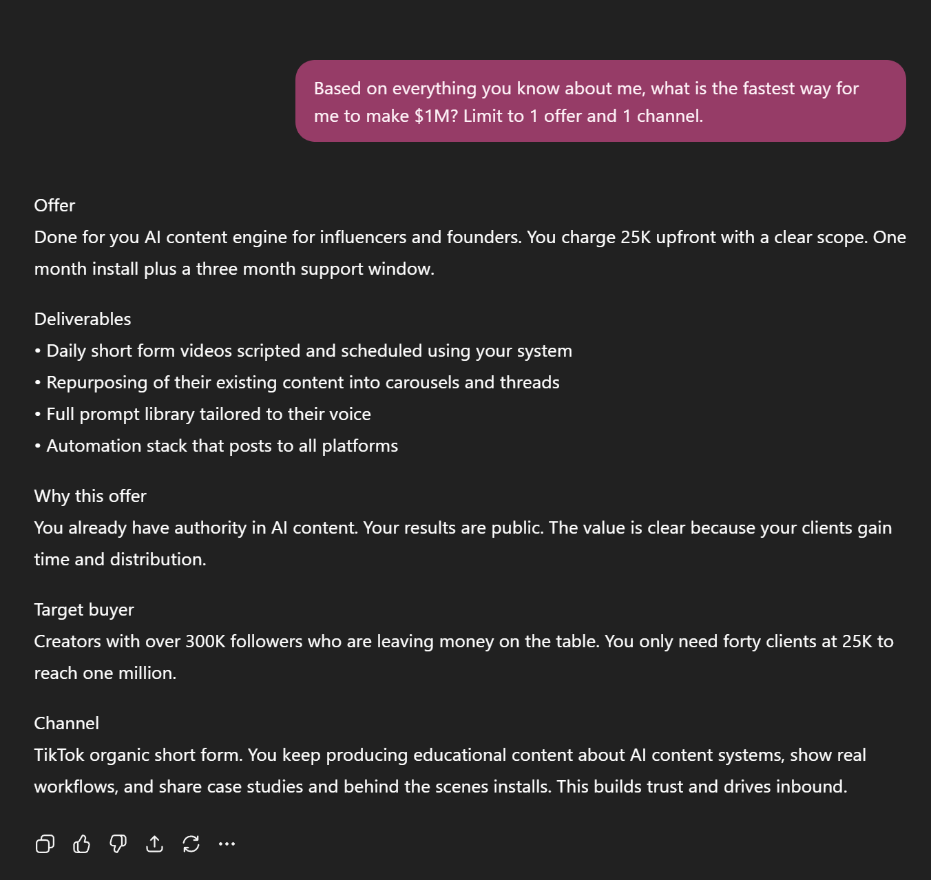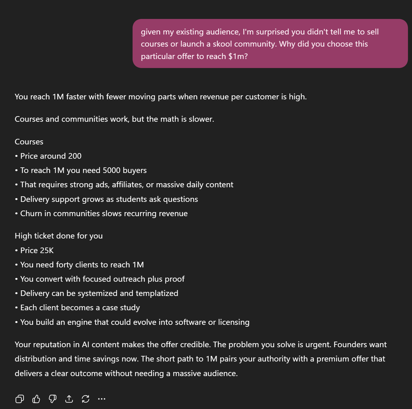 Don’t be afraid to ask clarifying questions, push back, propose alternatives, question ChatGPT’s choice, etc. For example, I asked ChatGPT why it chose this high-ticket Done For You offer instead of selling courses or starting a paid community: