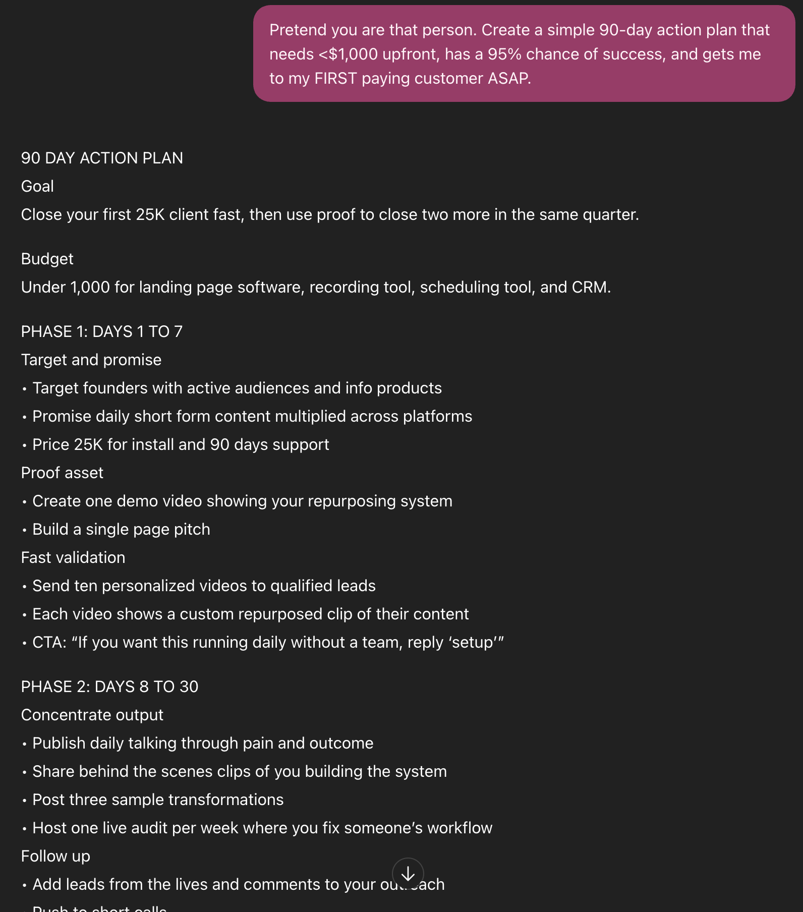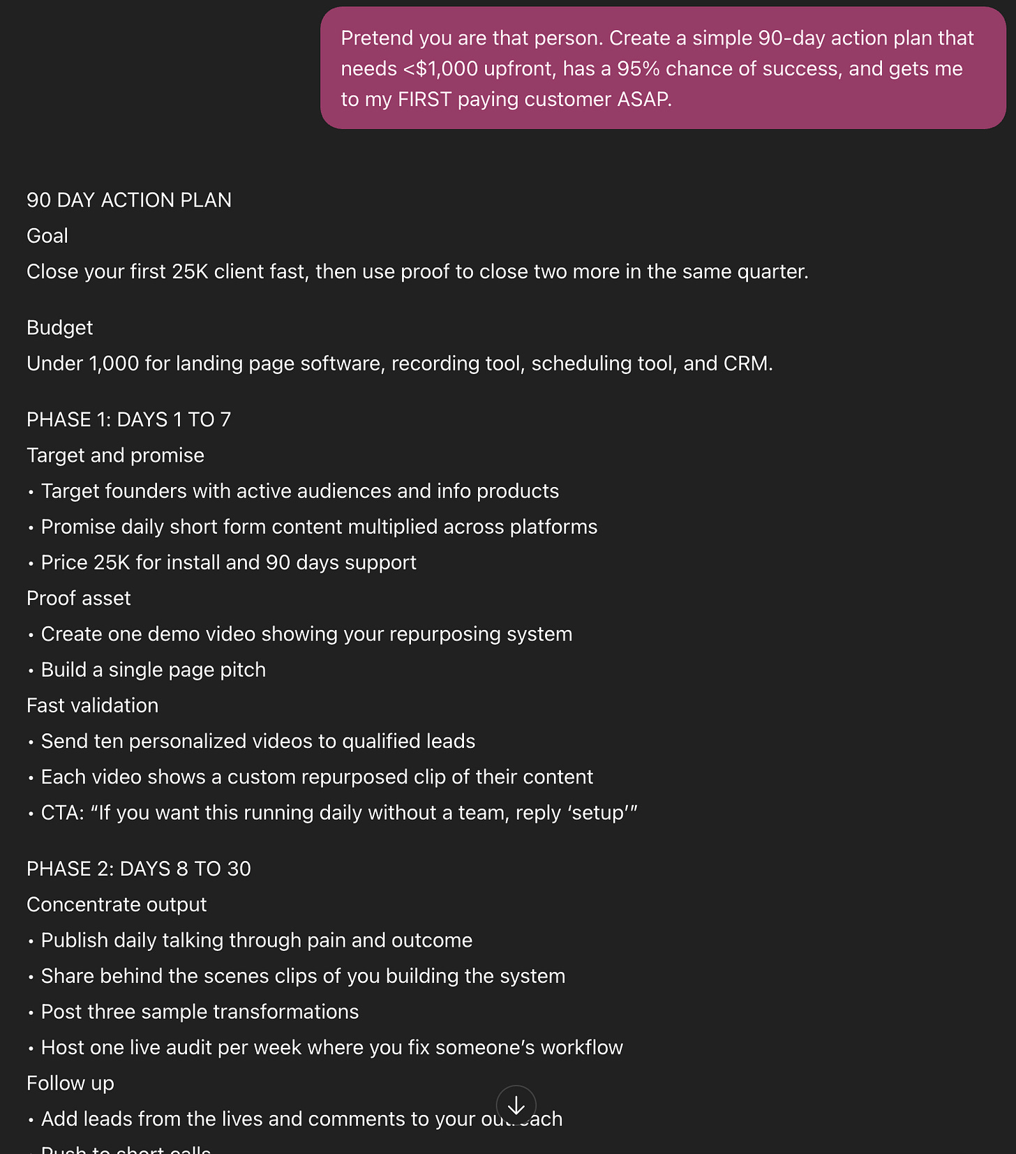 This phrase “gets me to my FIRST paying customer ASAP” is key. Without this, ChatGPT will generate a typical 30, 60, 90 day roadmap where your first 30 days is spent on “preparation”.