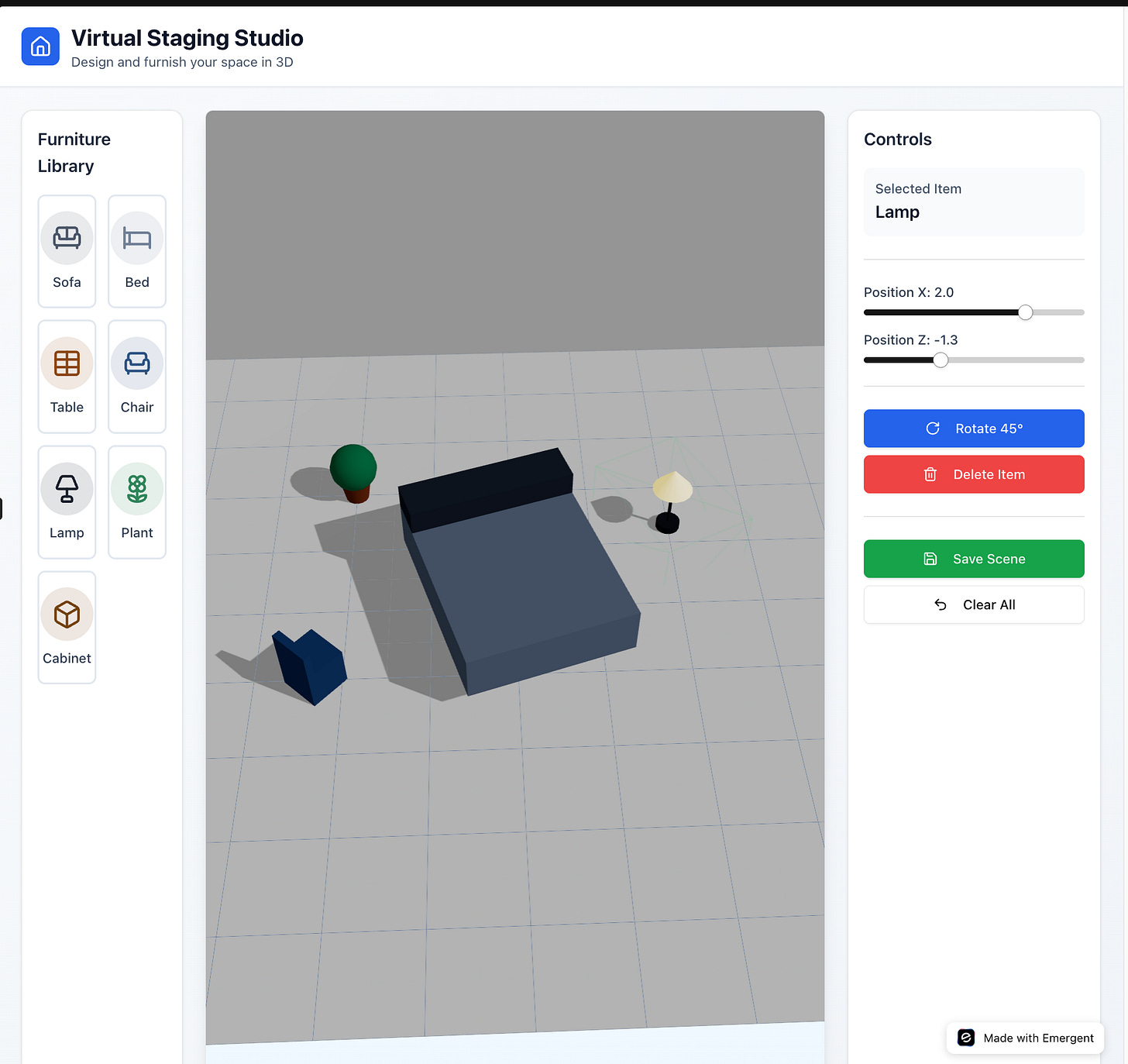 This is a simple 3D virtual staging tool to furnish an apartment using Three.js again. You can add pieces of furniture, arrange them as desired, rotate them, etc.