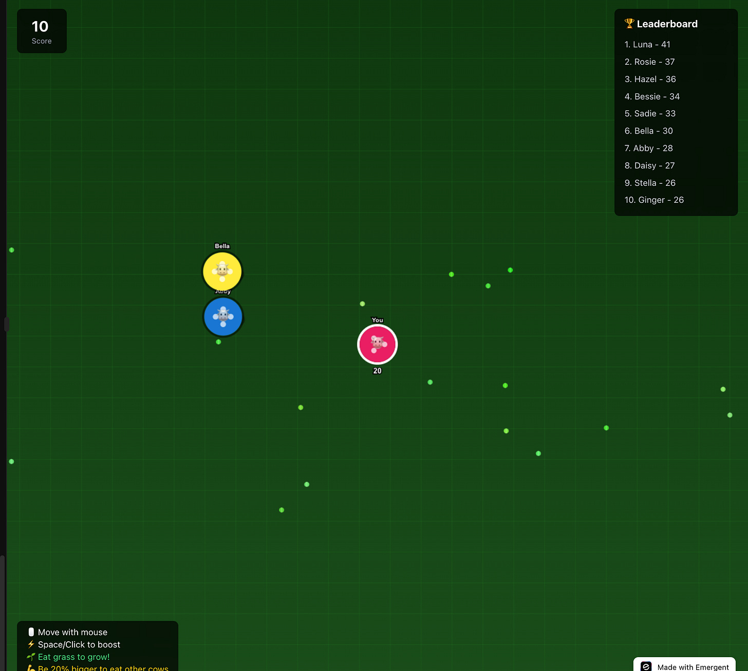 This is a Slither.io game clone except you’re a cow, eating food in a field, and growing larger. If you’re not familiar with Slither, it’s a megaviral web-based game that’s pretty fun.