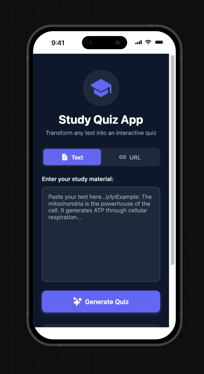 This mobile app helps you study for an upcoming quiz. Paste your study material or public URL (e.g. Wikipedia page), then AI will generate quiz questions automatically.