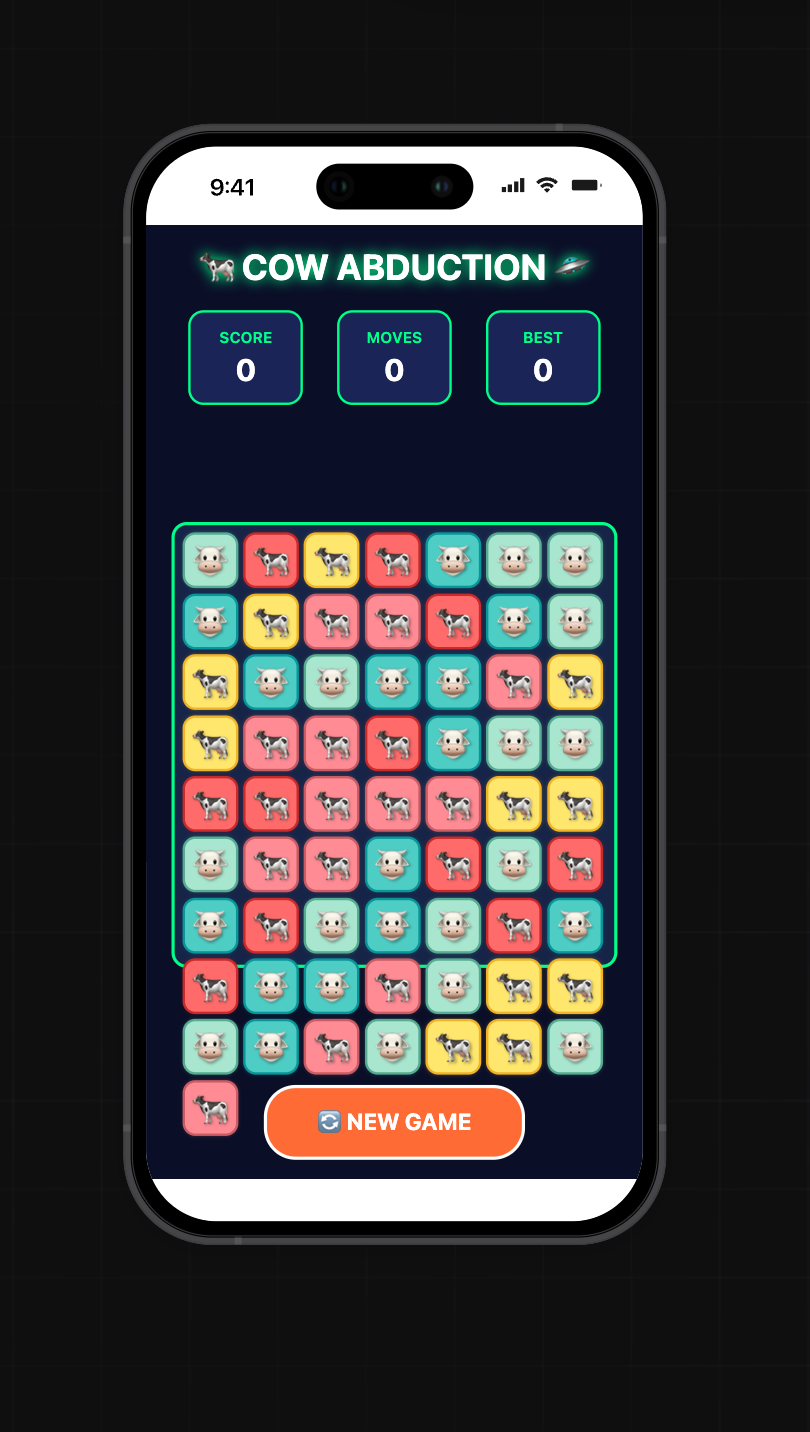 This is a Candy Crush clone with cows - you click on 2 cows to swap their position, and if there are several cows in a row, then they all get abducted by a UFO. The “swap” feature is a bit buggy because Emergent tried to implement it with swiping, instead of clicking, which didn’t work. That should be the first thing to fix. However, the UFO abduction animation is super cool, and Emergent made this much much faster than Rork.