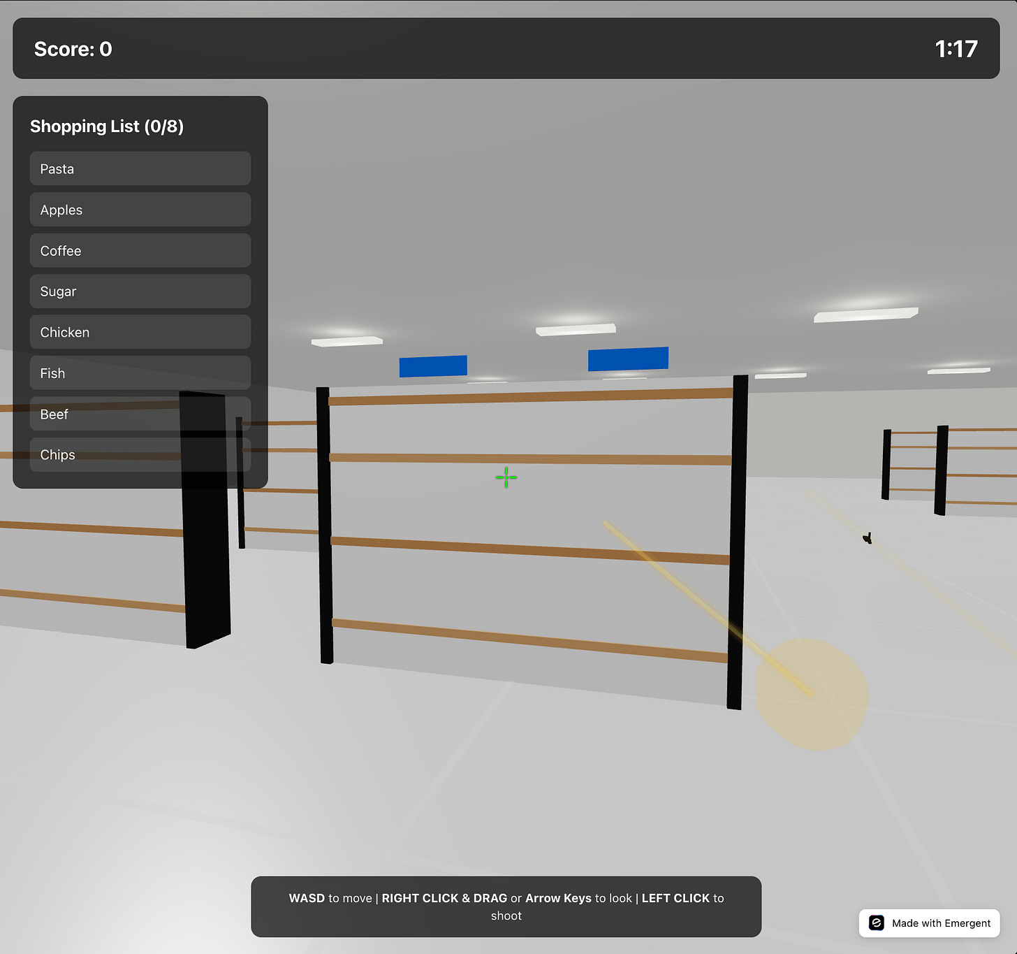 This was born from an identity crisis. It started as a web-based game inspired by Supermarket Sweep where you get a shopping list and go fetch the items. Then, it morphed into a shooter game where you can left-click to shoot and view the yellow projectile.