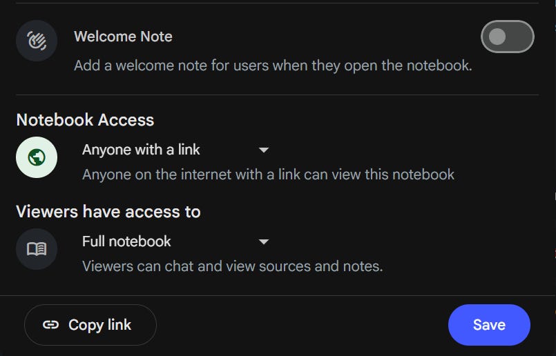 To share your notebook and slides publicly, click SHARE button in the top-right corner. Update NOTEBOOK ACCESS to “Anyone with a link”, then click “Copy link” and share it.