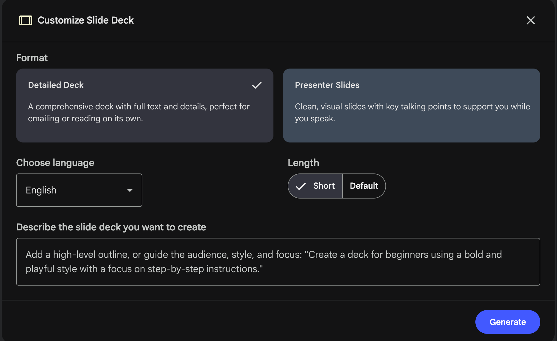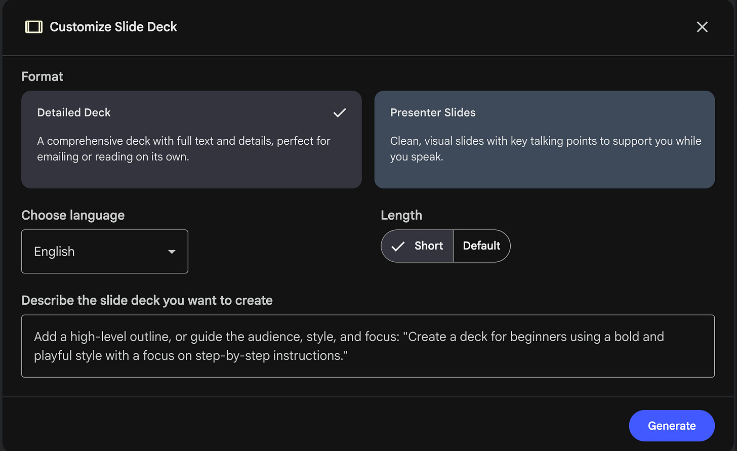 Where it says “describe the slide deck you want to create”, copy paste this prompt into it: