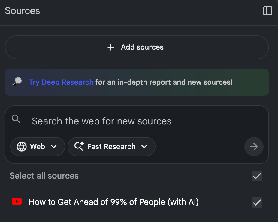 Add “Sources” on the left side, for example, add this Youtube video or search the web for new sources: