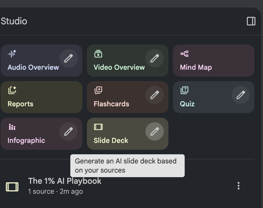 To create a new slide deck, go back to the main NotebookLM screen and click the pencil icon in SLIDE DECKS button again.